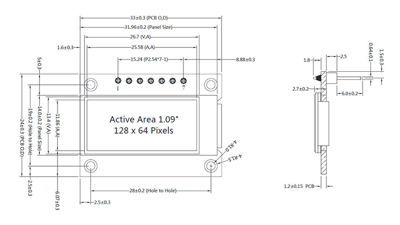 The monochrome 1.09" OLED Module is the graphic COB OLED display and made of 128x64 white OLED pixels, it is with Module Dimension of 33.00(W) x 24.00(H)x4.3(T) mm,AA size 25.58(W) x 10.86(H) mm.it builts in CH1115 controller ic,communicates via I2C serial interface. this OLED Module is Small,lightweight, low power consumption since it only powers the pixels that is necessary,suitable for industrial equipments,any embedded systems,medical and hand-held devices,securities.