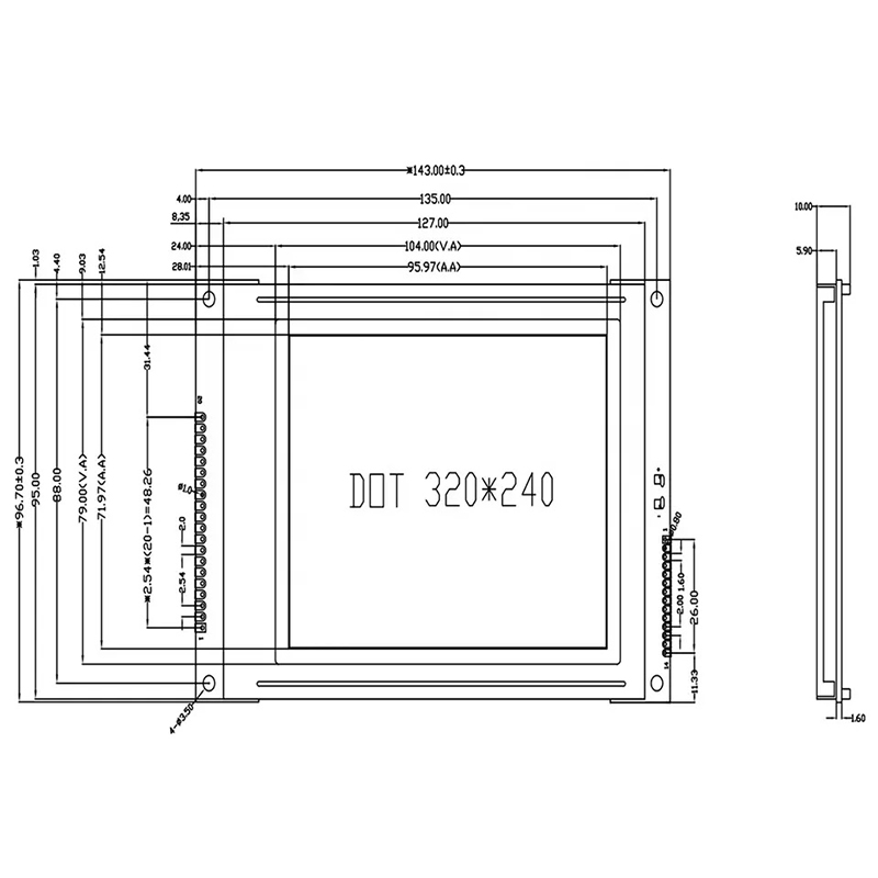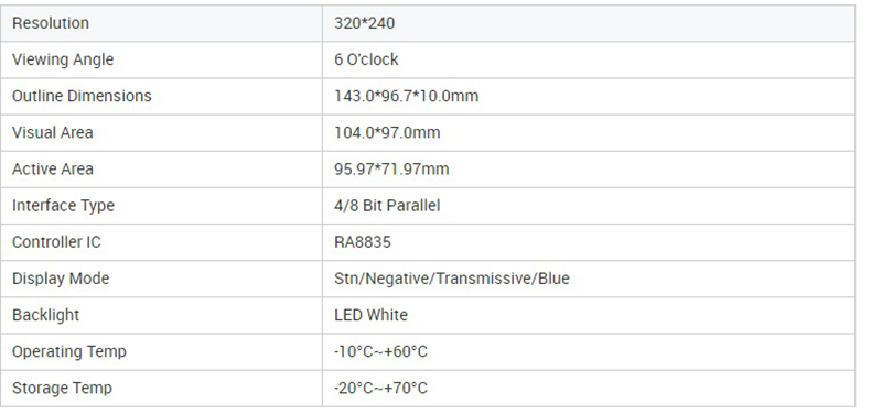 This 320x240 LCD Display is the graphic LCD display module which is made of 320x240 resolution,with the outline size 140 x 96.7 x 10.0 mm and active area size of 95.97 x 71.97 mm.This 320x240 graphic LCD display builts in with RA8835 controller IC or compatible controller. It supports 4 / 8 bit Parallel and 5V power supply,it also Negative