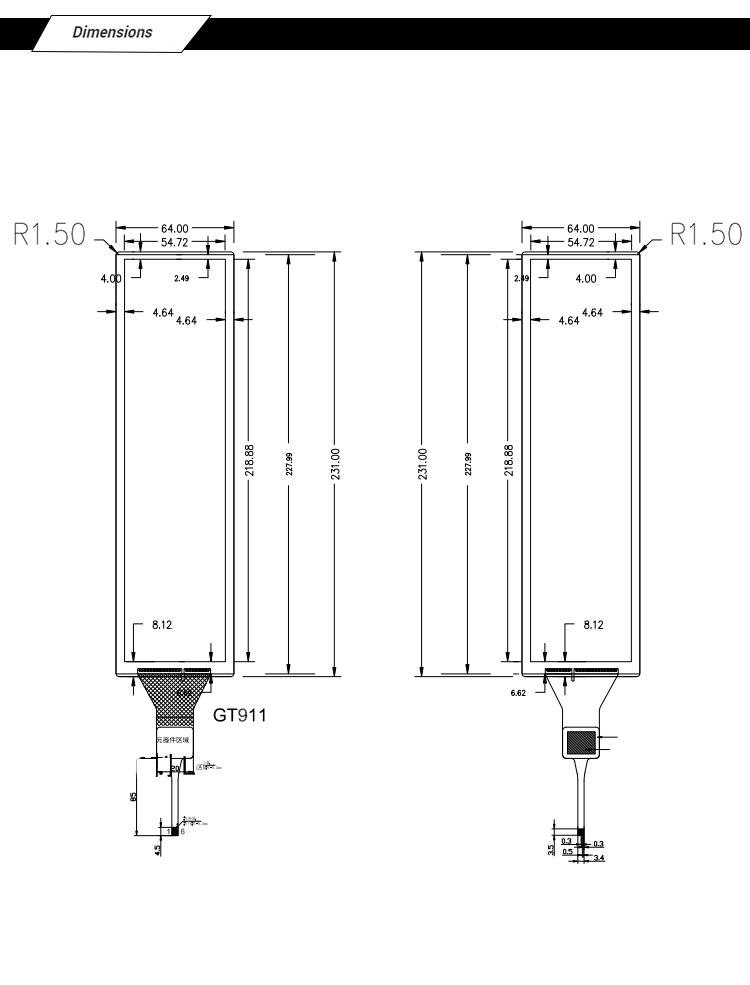 This 8.8"TFT is a IPS Mini color TFT LCD display module is made of resolution 480x RGBx1280 pixels,with outline dimension of 64.3 x 231.3 (typ) mm and AA size 54.72(H) x 218.88(V) mm.this 8.8" TFT display builts in ILI6482B Driver IC and supports MIPI interface,with full viewing angle and wide range of operating Temperature,it is ideal to be used in industrial device,any embedded systems,medical equipment,wearable devices,security and hand-held devices which requests TFT display with high quality and colorful images.