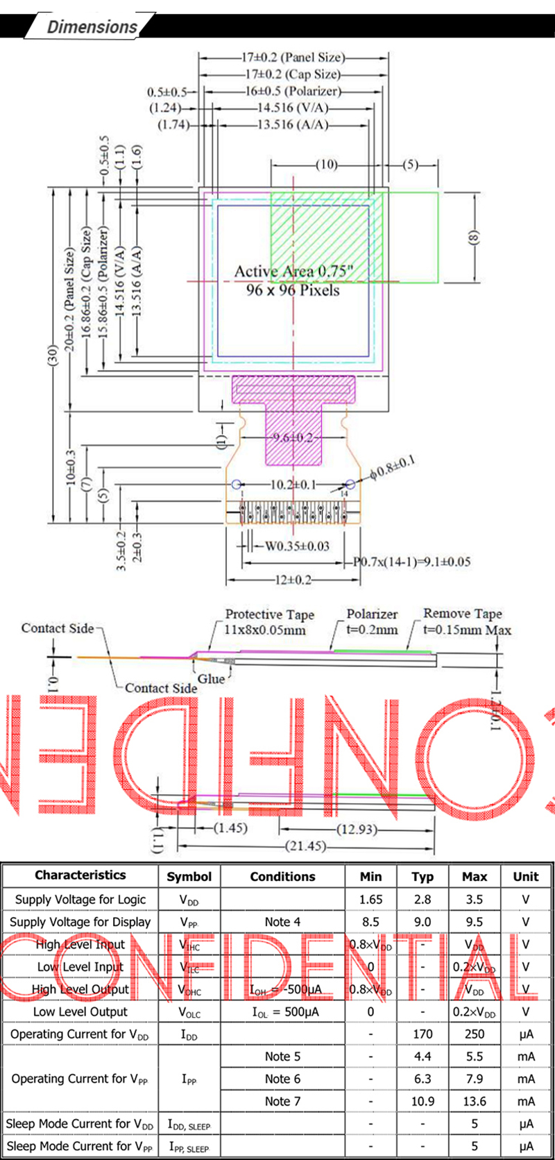 This 0.75" OLED is a Mini graphic OLED display module which is made of 96x96 pixels white OLED,it is with outline dimension of 17.0× 30.0 mm and AA size 13.516 × 13.516 mm, it builts in SH1108 controller ic,communicates via 4-Wire SPI/I2C serial interface.this mini COG OLED display is very thin,lightweight and low power consumption since no backlight is needed;so it has such high contrast,extremely operating temperature,applied for any embedded systems,wearable device,industrial devices,medical and hand-held devices,personal care appliance, voice recorder pen and securit,mp3,etc.